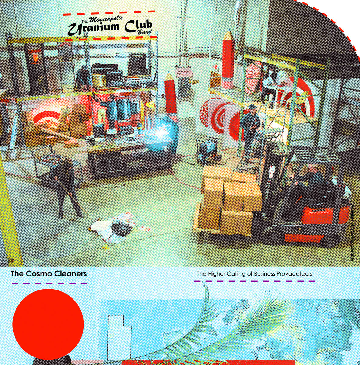 "You're being urgently, naughtily rushed up the tallest, steepest stairs you've ever climbed. Smile cautiously as the Uranium Club welcomes you into their stinky apartment. You've been here before, right? Oh, that must have been some one else. Do you have a brother or sister? One of the members mumbles some deceptively eloquent bullshit as he hands you a drink. His lips are dark red and chapped; he looks really bad. But the drink is wet, and those stairs had been tall. Sit down, lean back, sip it. There's salt in it, some pulp, some pebbles. It rolls around your tongue, hides between your teeth, a perfectly TV-worthy combination of pleasure and mischief. Swallow it. But spit it out... Spit it out now! It's supposed to go into your ears! How crazy is that? Such a sensation of taste, transmogrified for the realm of sound? Is it Sprite, or is it... music? Careful, engaging, and dare-I-say theatrical vocals over hyper bass-and-drums while other boingy-boingy instruments puke all over it, all over the whole show. That's called synesthesia. Gentle lectures, dangerous storytime, eerie fast-and-slow nightmare riffs, and a taut, bound-and-gagged rhythm section. Boingily-boingily, that's phantasmagoria. That's the Uranium Club's latest album, "The Cosmo Cleaners." So swish around some mouthwash and plug in your AirPods, kid, it's time to drop that needle!" - Alex Ward
